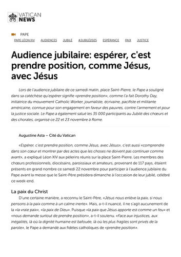 D'une certaine manière, a reconnu le Saint-Père, «Jésus nous enlève la paix, si nous pensons à la paix comme à un calme inerte». Mais, a-t-il nuancé, il ne s’agit aucunement de la «la vraie paix», «la paix de Dieu». Puisque «la paix que Jésus apporte est comme un feu» et «nous demande surtout de prendre position», a-t-il soutenu. «Face aux injustices, aux inégalités, là où la dignité humaine est bafouée, là où les plus fragiles sont privés de la parole», le Pape a demandé aux fidèles catholiques de «prendre position». La figure inspiratrice de Dorothy Day S’inspirant de la figure de Dorothy Day, une «petite grande femme américaine», qui a vécu au siècle dernier, le Pape a noté qu’elle «avait le feu sacré» et a «pris position» voyant que le modèle de développement de son pays ne créait pas les mêmes opportunités pour tous. Cette Américaine engagée toute sa vie pour la justice sociale et les droits des personnes, en particulier des pauvres, des travailleurs exploités, des marginaux de la société, a été déclarée Servante de Dieu en 2000. En tant que chrétienne, a continué le Souverain pontife, «elle a compris qu’elle devait s'engager auprès des travailleurs, des migrants, des laissés-pour-compte d'une économie qui tue». «Elle écrivait en tant que journaliste», elle réfléchissait et faisait réfléchir», a précisé le Sucesseur de Pierre. «Écrire est important. Et lire aussi, aujourd'hui plus que jamais», a-t-il détaillé. Il faut donc, a encore proposé le Souverain pontife, «unir l'esprit, le cœur et les mains». Être artisans de paix signifie, àl'instar de Dorothy Day, «prendre position» tout en assumant les conséquences, a fait savoir Léon XIV, affirmant dans la foulée que la journaliste américaine, figure catholique inspirante ayant œuvré pour le bien commun et pensé la question du travail, a mobilisé des milliers de personnes, qui à leur tour ont ouvert des maisons dans de nombreuses villes et quartiers, «des lieux de charité et de justice où l'on peut s'appeler par son nom, se connaître les uns les autres, et transformer l'indignation en communion et en action».