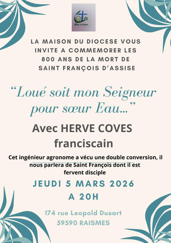 LA MAISON DU DIOCESE VOUS INVITE A COMMEMORER LES 800 ANS DE LA MORT DE SAINT FRANÇOIS D’ASSISE avec Hervé COVES, franciscain et ingénieur agronome.