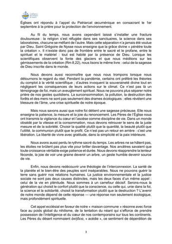 Au fil du temps, nous avons cependant laissé s’installer une fracture douloureuse : la religion s’est réfugiée dans ses sanctuaires, la science dans ses laboratoires, chacune se méfiant de l’autre. Mais cette séparation n’a jamais été voulue par Dieu. Saint Grégoire de Nysse nous enseigne que la grâce divine « pénètre toute la création ». Il n’existe donc pas de frontière entre le sacré et le profane, entre le spirituel et le matériel : tout est habité par la présence de Dieu. Lorsque les scientifiques observent la fonte des glaciers et que nous méditons sur les gémissements de la création (Rm 8,22), nous lisons le même livre : celui de la sagesse de Dieu inscrite dans le monde. Nous devons aussi reconnaître que nous nous trompons lorsque nous détournons le regard du réel. Pendant la pandémie, certains ont préféré les théories du complot à la vérité scientifique ; d’autres invoquent la souveraineté divine tout en négligeant les conséquences de leurs actions sur le climat. Ce n’est pas là un témoignage de foi, mais un aveuglement spirituel. Nous ne pouvons plus séparer notre prière de nos gestes quotidiens. La surconsommation, la pollution, la destruction des forêts et des mers ne sont pas seulement des drames écologiques : elles révèlent une blessure de l’âme, une crise spirituelle de notre époque.