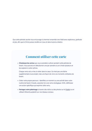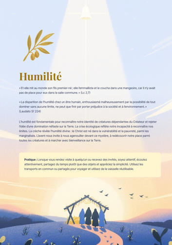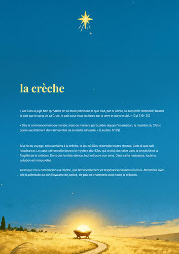 La carte du pèlerin proposée est un guide pour visiter sept vertus écologiques (cf ci-dessous) qui nous mèneront à notre destination : la crèche, où l’espérance renaît et où toute la création est renouvelée.