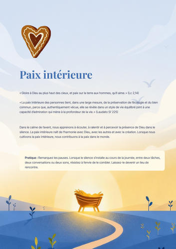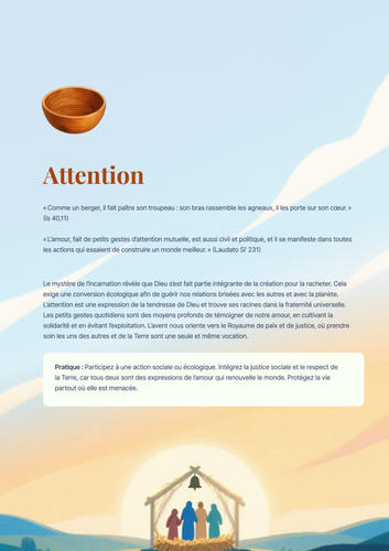 Chaque étape de ce pèlerinage de l’avent devient une occasion de louer, de rendre grâce, de prendre soin et de vivre avec humilité et simplicité, en nourrissant la paix intérieure et la joie qui jaillissent de notre rencontre avec le Christ et toute la création. Que cette période sacrée nous encourage à cheminer ensemble vers Noël avec espérance, gratitude et joie, afin que le Christ puisse renaître en nous et dans toute la création