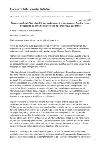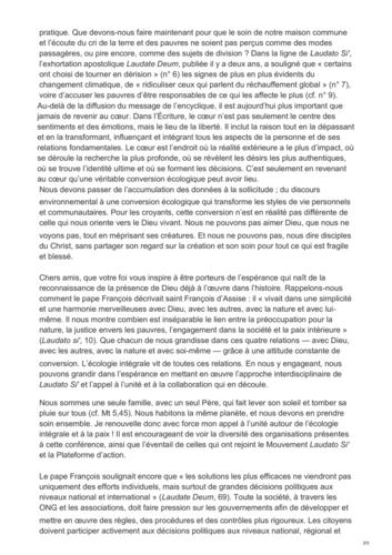 Lien vers le texte entier : Pour une véritable conversion écologique - ZENIT - Français